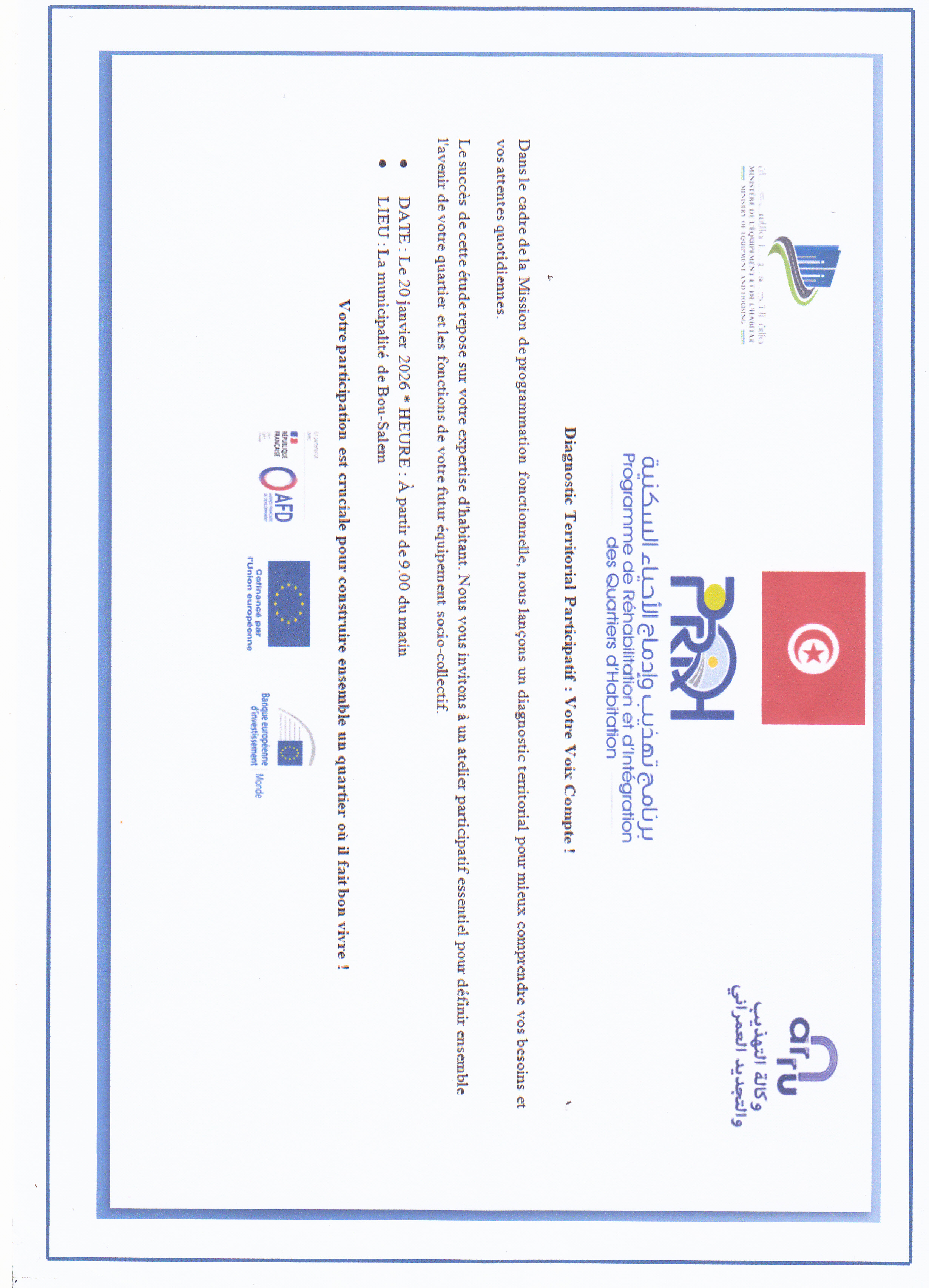 تتشرف المكلفة بالكتابة العامة لبلدية بوسالم باعلام متساكني حي النور بعقد جلسة عمل تشاركية للنظر في مقترحاتهم لعنصر التجهيزات المبرمج انجازه من طرف وكالة التهذيب والتجديد العمراني وذلك يوم الثلاثاء 20 جانفي 2026 ابتداء من الساعة التاسعة صباحا بقصر البلدية
